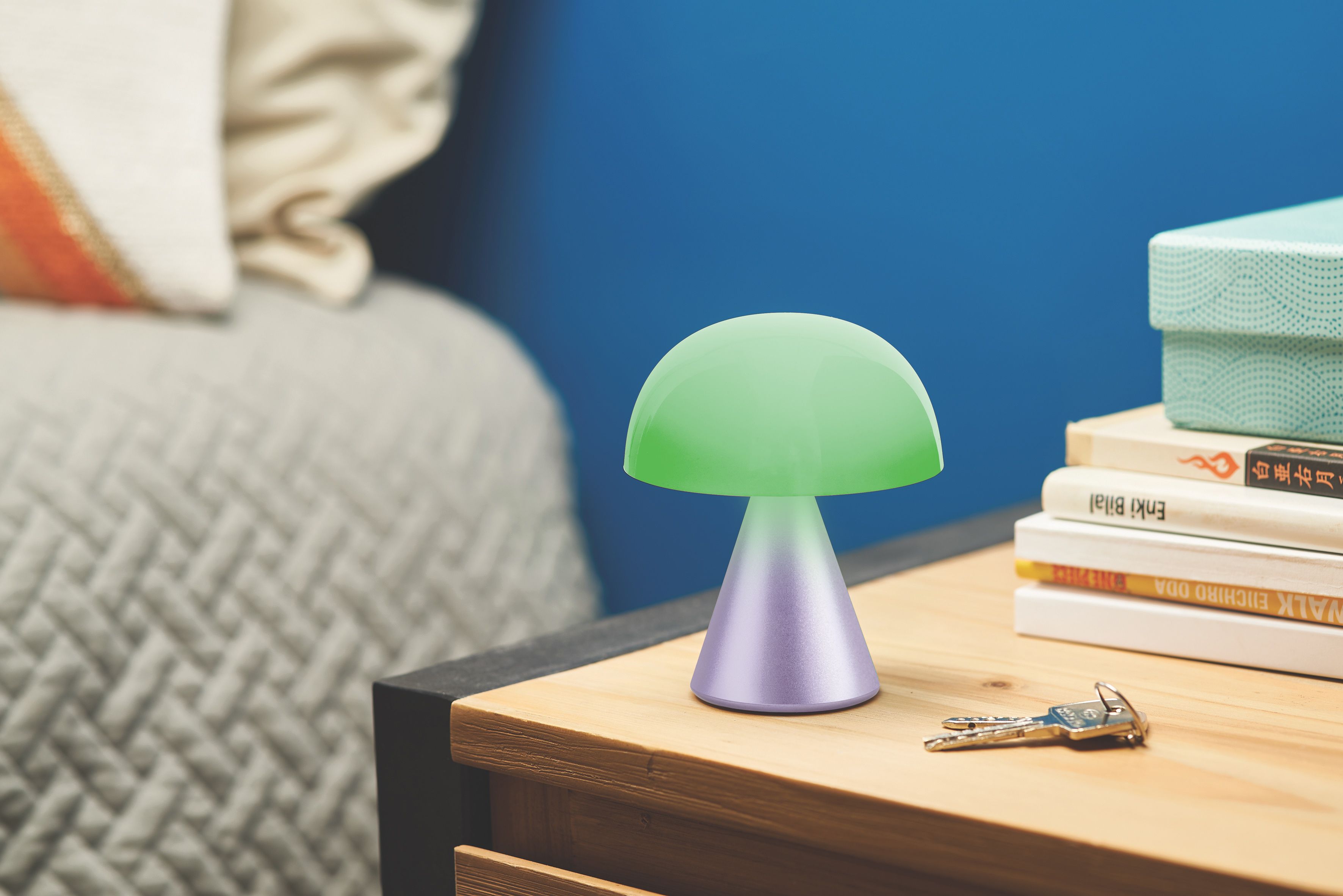 Mina M bringt eine beeindruckende Farbpalette von 9 LED-Lichtfarben auf Ihren Nachttisch, Arbeitsplatz oder Ihre Terrasse. Der Farbwechsel und die Dimmfunktion werden alle durch eine Druckfunktion auf der Oberseite der Leuchte gesteuert.