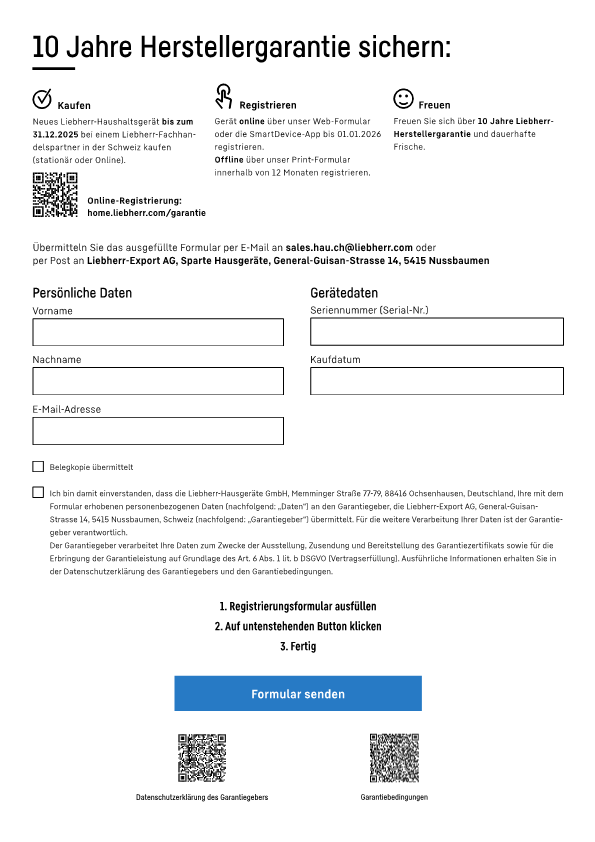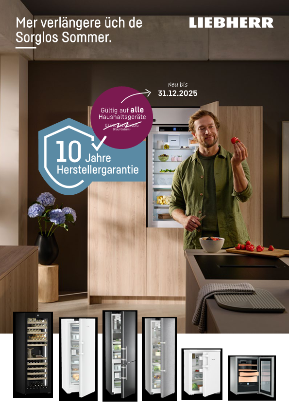 Beim Kauf eines Liebherr Gerätes bis zum 31.12.2025 profitieren Sie von einer Hersteller-Garantie von 10 Jahren. Gerät einfach nach dem Kauf registrieren und profitieren!