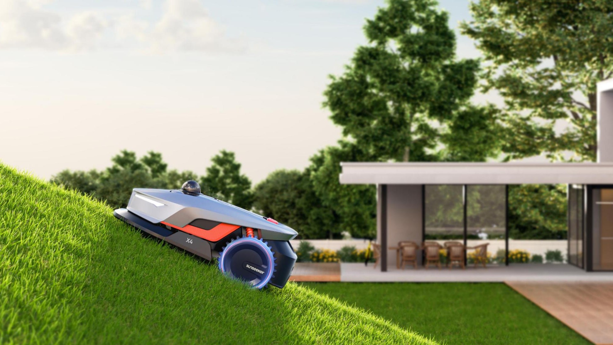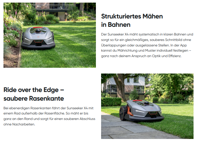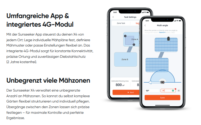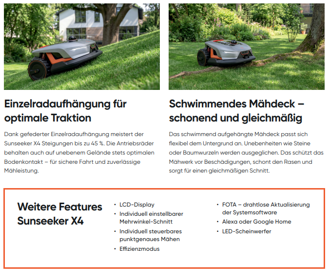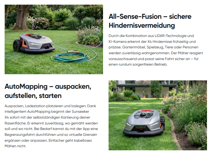 Der Sunseeker X4 nutzt LiDAR 3D-Navigation, ein laserbasiertes System, mit dem er seine Umgebung dreidimensional scannt, in Kombination mit einer KI-Kamera. So erkennt er Rasenflächen, Hindernisse und Rasengrenzen ganz ohne Begrenzungsklabel oder Satellitensignale. Der integrierte 10-TOPS-Chip verarbeitet alle Sensordaten in Echtzeit und ermöglicht eine sichere Orientierung und Hindernisvermeidung - auch in komplexeren Gärten und einsetzender Dunkelheit. Virtuelle Grenzen lassen sich bei Bedarf ganz einfach mit der App korrigieren oder neu festlegen.